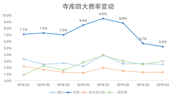 2019年q4,寺库运营总支出同比下降7.5%至2.46亿元,在过去8个季度中最为“节制”。其中,寺库大幅削减了营销支出,该项费用自上市以来首显负增长,同比下滑30.9%至1.06亿元。