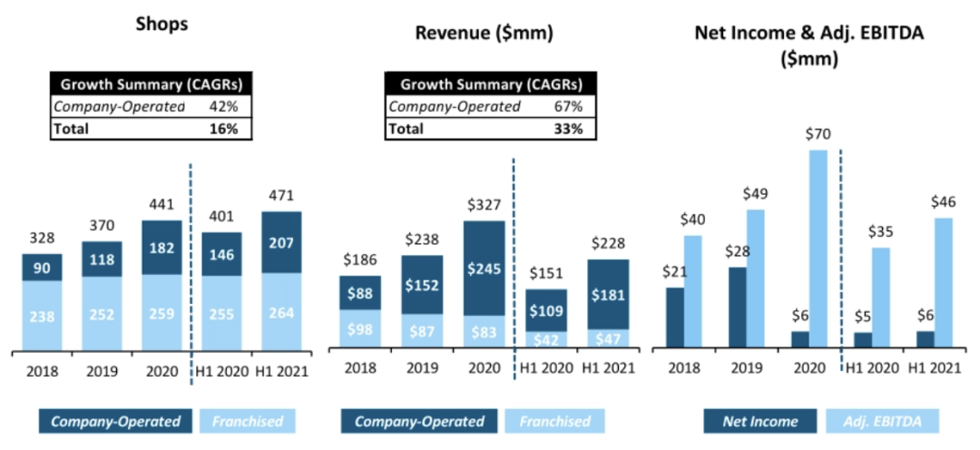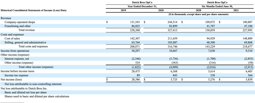 2021年上半年,dutch bros总收入为2.28亿美元,同比增长51%;净利润为583.9万美元,同比上涨11%,调整后 ebitda约4580万美元。