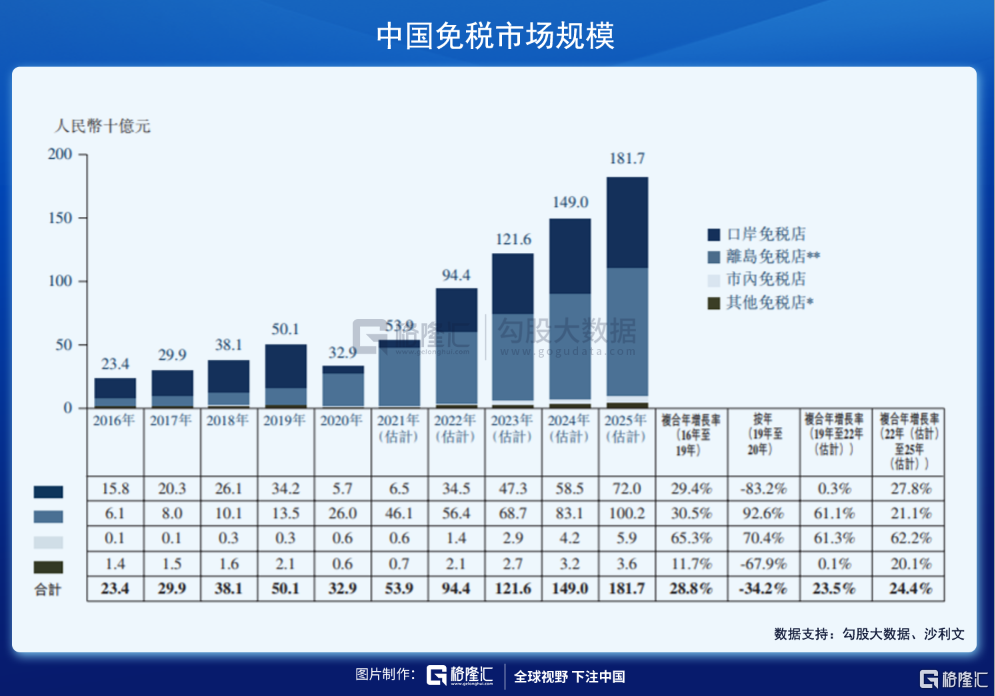 另据海南省“十四五”规划,海南岛离岛免税规模于2021、2022、2025年的规模分别为600亿、1000亿、3000亿元人民币,较沙利文分析的预测更为乐观。