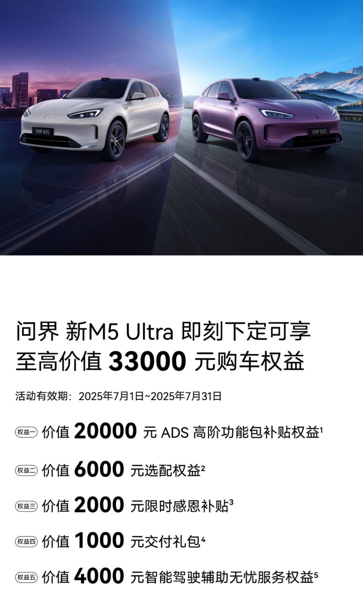 问界新m5 ultra在定价上就极具竞争力,在此基础上,还为消费者提供了真金白银的重磅优惠。即日起至7月31日,购车即享至高33000元的五重豪华礼遇。这一优惠力度在同级别车型中实属罕见,让消费者能够以更加实惠的价格拥有这款高性能的智能suv。