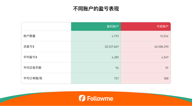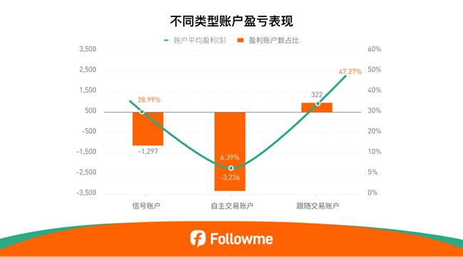 在平台的三类账户中(自主交易、跟随交易、信号提供者),跟随交易账户表现最为稳健,其中47.27%的账户实现净盈利,平均净收益为 322 usd。相比之下,自主交易账户的平均亏损为 3,236 usd,整体表现远不及跟随账户。