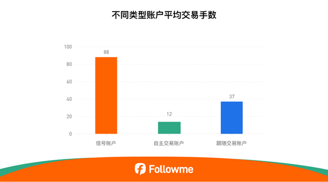 信号账户的平均交易手数为 88 手,显著高于其他类型账户,体现出信号提供者更偏向高频、进取型策略的交易风格。而自主交易账户表现相对较弱,仅为 12 手,整体操作频率较低,反映出这类用户在策略选择上更为分散,且可能受限于技术能力与交易信心。