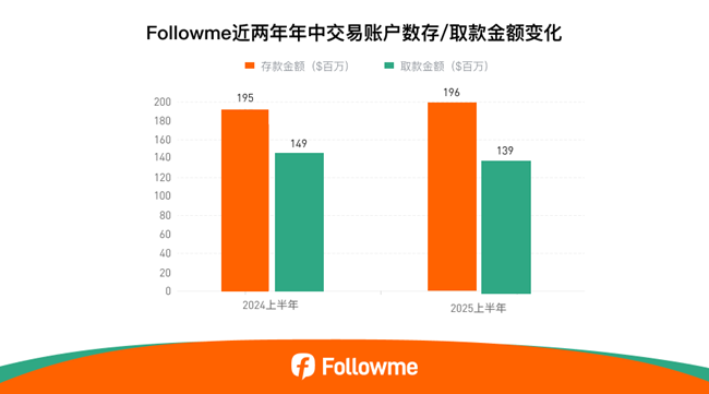 2025年上半年,followme 所有活跃账户总存款金额为 1.95亿 usd,与2024年同期基本持平,账户平均存款 11,058 usd;总取款金额为 1.49亿 usd,同比下降7%,账户平均取款 7,867 usd。