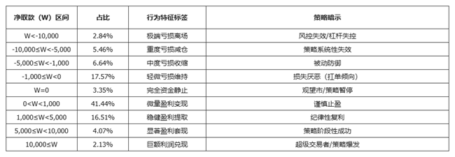约三分之一(32.5%)的账户处于净亏损状态,其中 超过8%为深度亏损账户(净取款低于 -5,000 usd),反映出部分用户面临严重的资金回撤与策略失效。