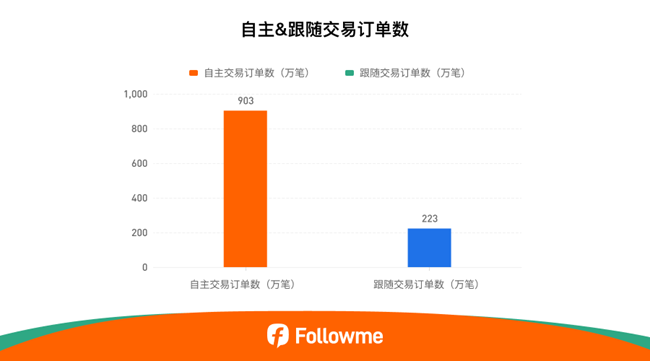 2025年上半年,followme 交易社区所有 mt4 账户累计交易 15,246,746 笔订单,平均每个交易日完成 120,053 笔订单。其中,自主交易订单数与跟随交易订单数之比为 4:1。