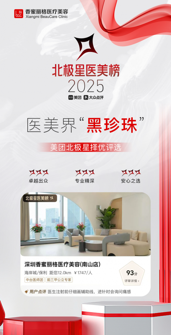 2025年8月22日,美团在杭州正式发布2025“北极星机构榜”。深圳香蜜丽格医疗美容在评选中脱颖而出,高分荣登“北极星机构榜”,成为深圳地区仅有的9家上榜机构之一。