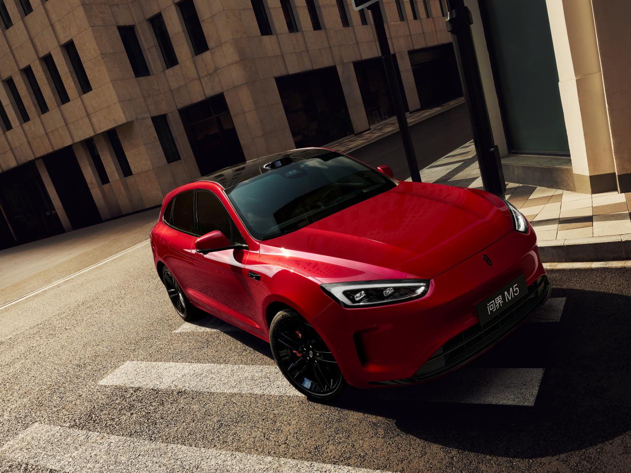 尤其当黑曜运动轮毂、跃动红色卡钳与全面黑化的车窗饰条及车标融为一体,问界新 m5 ultra跃影红的个性审美便被推向极致——低调中蕴藏张扬,沉稳中迸发激情。使其在众多车型中脱颖而出,展现出年轻消费者所喜爱的低调张扬气质。它也精准捕捉年轻一代渴望表达、追求独特的态度,让每一次出行皆化身街头焦点,诠释“敢耀自我,活在当下”的鲜明主张。