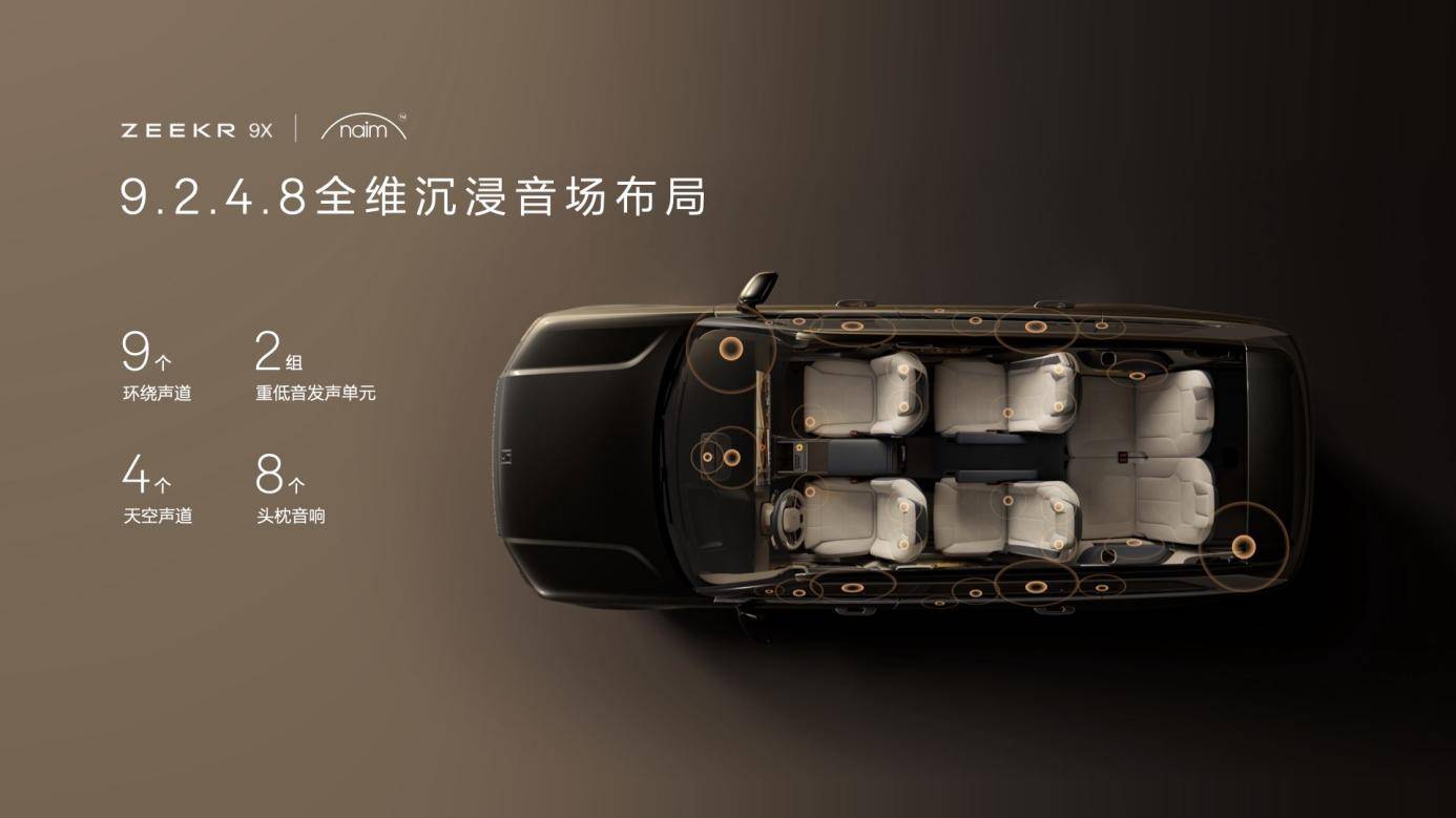 在极致的静谧表现之上,极氪与英国皇室御用音响品牌naim深度合作,为极氪9x联手打造全球最大功率的车载音响。它拥有3868瓦的峰值功率,32个扬声器,支持杜比全景声,采用9个环绕声道、4个天空声道、8个头枕音响及2个低音炮,让每个座位都能享受殿堂级沉浸音效。