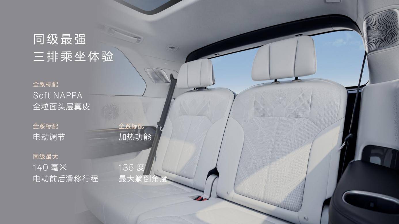 第三排同样不打折。极氪9x采用一体式压铸后端铝车身与强化cd柱结构来保护碰撞安全,能承受时速105公里的追尾与侧碰冲击。第三排还拥有同级最强的乘坐体验,最大135度躺倒角度与同级最大140毫米电动滑移行程,加上专属独立天窗与“坐坐高升”布局,让第三排成为通透明亮的阳光房。